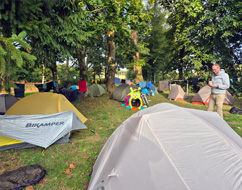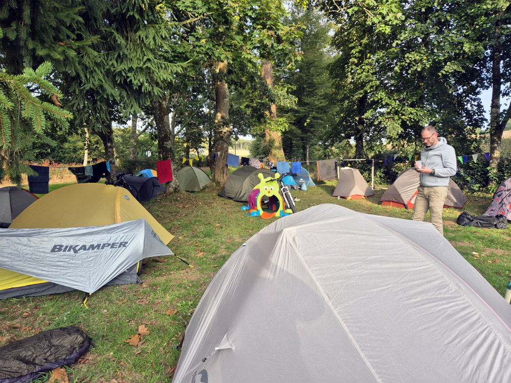 L’espace est aménagé pour tentes, avec des emplacements spacieux et des services pensés pour les voyageurs à vélo : points d’eau, sanitaires, espace de réparation pour vélos. À deux pas, de nombreuses